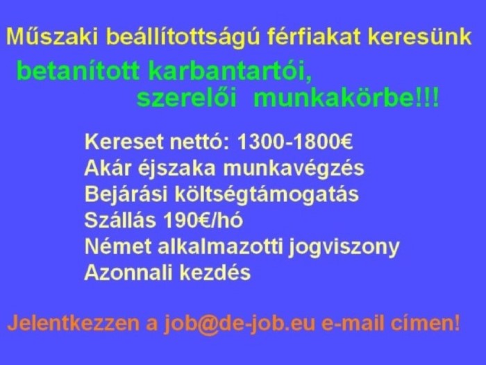 - Küldje el szakmai fényképes önéletrajzát a job@de-job.eu e-mail címre "KARBANTARTÓ" tárggyal!